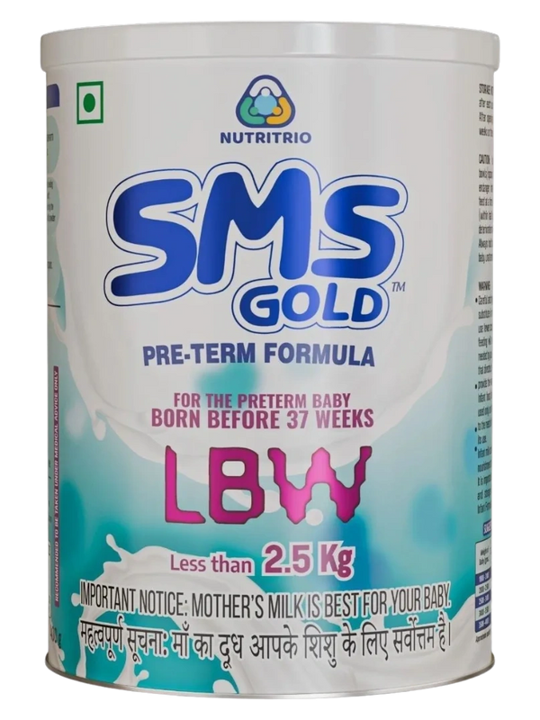 SMS GOLD is a follow-up formula for pre-term baby BORN BEFORE 37 WEEKS LBW, supporting growth, brain and vision development, digestive health, and immunity with nutrients like protein, calcium, vitamins, DHA, ARA, and prebiotics.