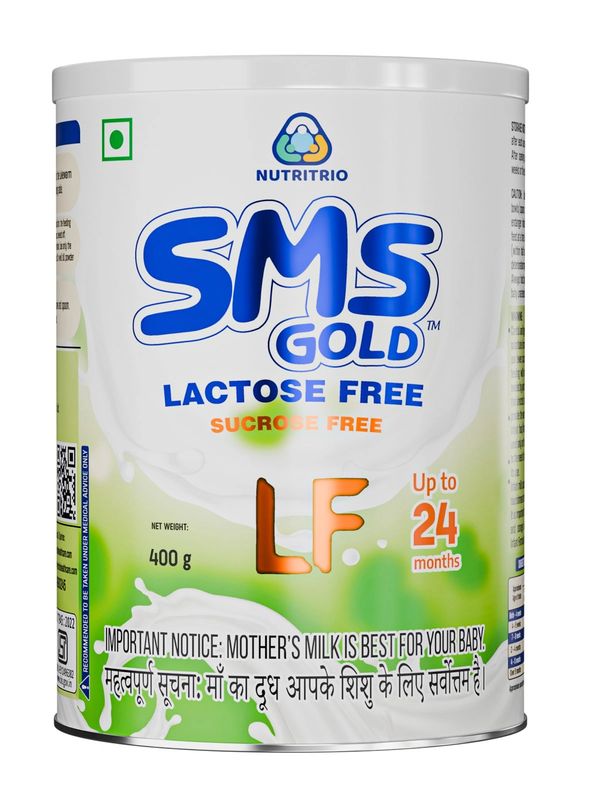 SMS GOLD LACTOSE FREE sucrose free is a follow-up formula for Up to 24 months, supporting growth, brain and vision development, digestive health, and immunity with nutrients like protein, calcium, vitamins, DHA, ARA, and prebiotics.